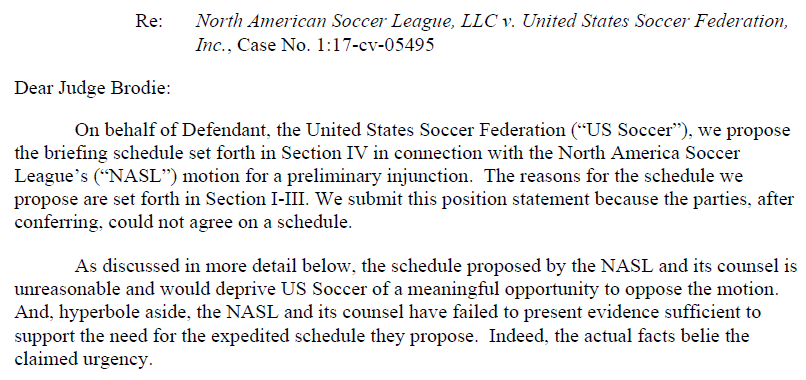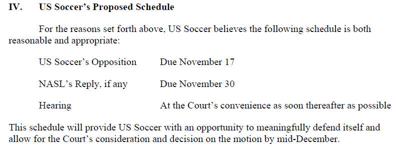 In short: “NASL seeks an order that would eviscerate USSF’s standing as the governing body for soccer and seriously harm its relationship with FIFA.”