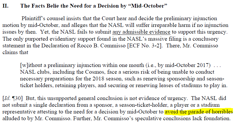 “Oh, and they’ve based all their “showing of harm” on the declaration of an owner (NY Cosmos’ Rocco Commisso) who just joined this sinking ship a few months ago. Now they’re crying about how impossible life would be in D3, to which we offer three letters: USL.