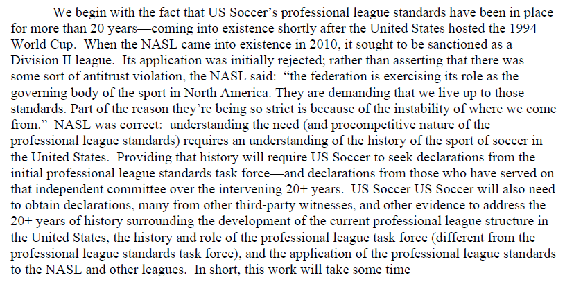 - “Here, the NASL asks the Court to decide the right structure for professional soccer in the United States, and to reject the successful framework established by USSF decades ago.”